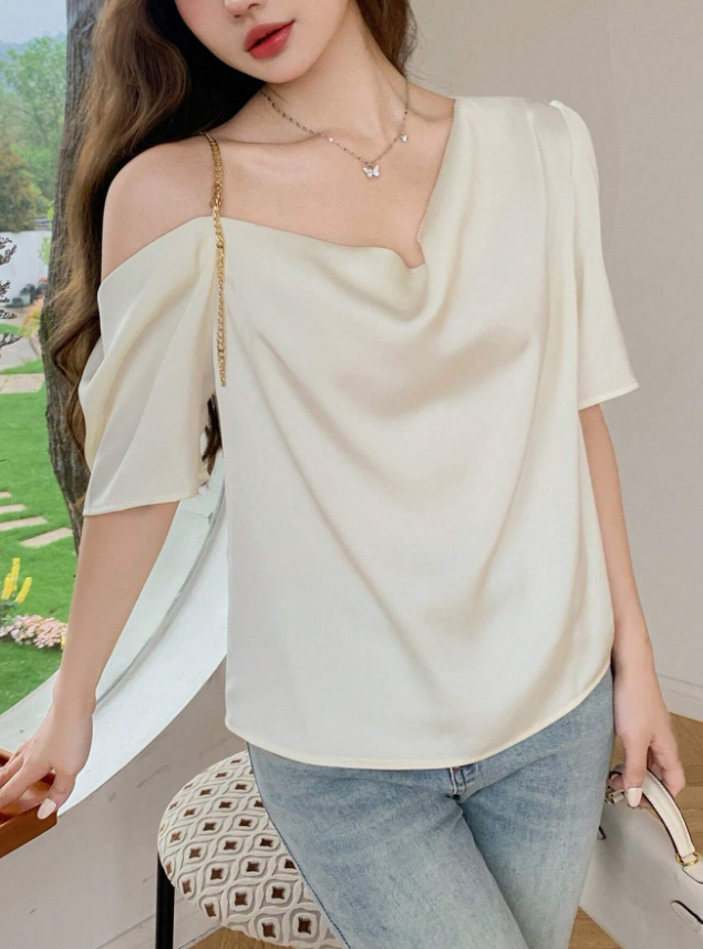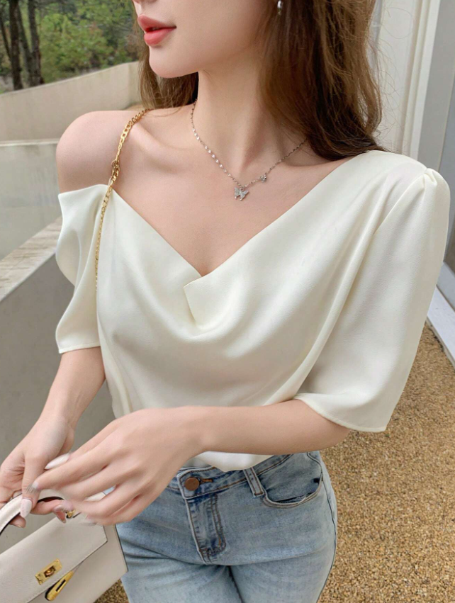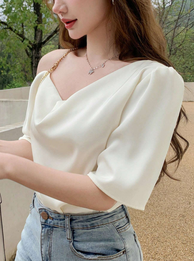 Camiseta de manga corta con elegante escote caído drapeado que aporta sofisticación a tu look. Confeccionada en tejido no elástico 100% poliéster de alta calidad, esta prenda unicolor ofrece un acabado pulido y profesional. Ideal para combinar con prendas formales o casuales, garantizando comodidad durante todo el día.