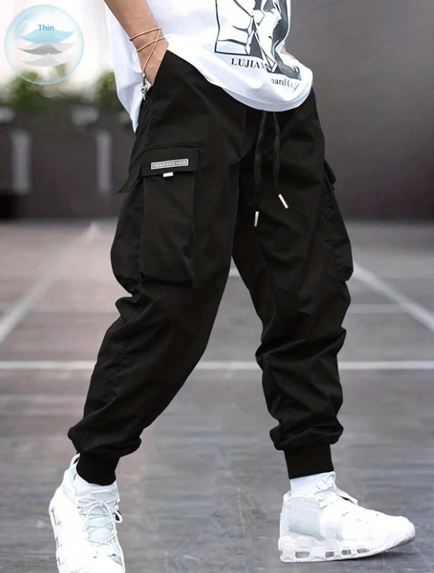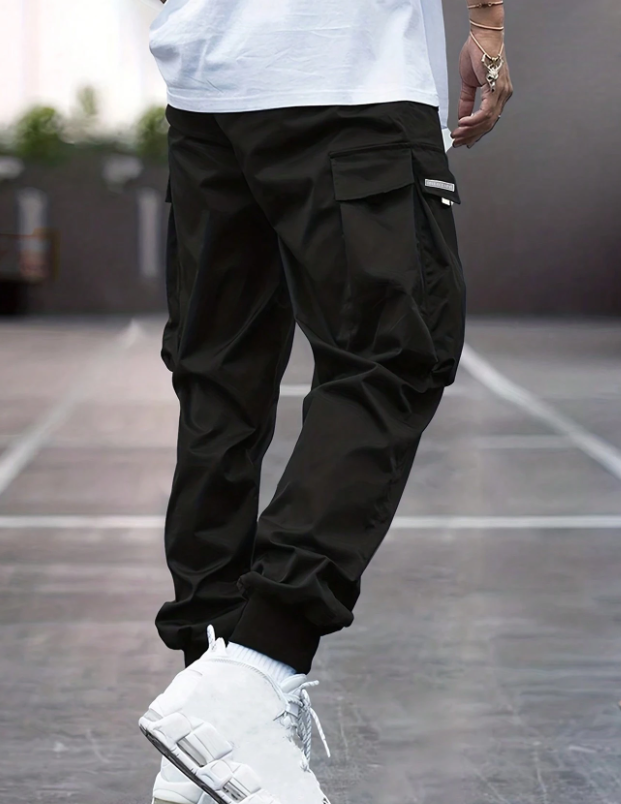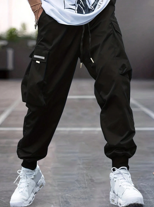 Pantalones cargo versátil diseñados para comodidad y funcionalidad. Confeccionados en poliéster 100% con ajuste suelto que permite libertad de movimiento, estos pantalones presentan bolsillos con solapa para mayor seguridad de tus pertenencias. El cordón ajustable en la cintura garantiza un calce personalizado, mientras que el gráfico de letras añade un toque de estilo contemporáneo. Disponibles en negro clásico, son la opción ideal para uso casual o laboral. Sin elástico para un look más estructurado y definido.